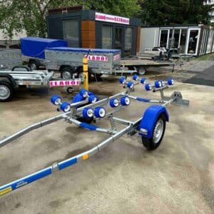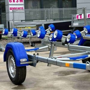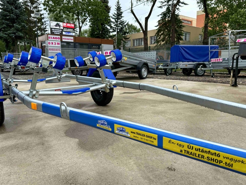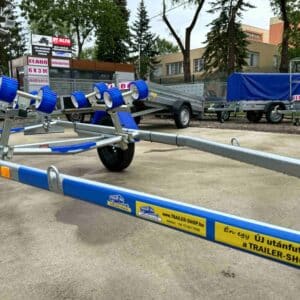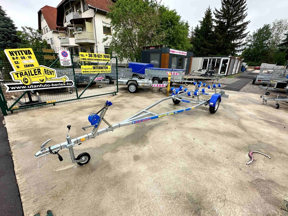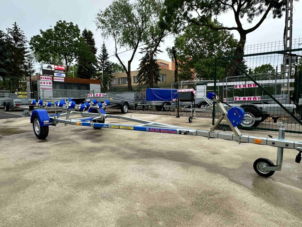ALFA-B Marine 27420HG.130A Egytengelyes, 7,45(8,45)x1,98m, 1300kg, fékezett, görgős, csónakszállító, hajószállító, max. 7,4m hajóig