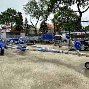 Az Alfa Marine csónakszállító utánfutó tűzihorganyzott acélszerkezete maximális védelmet biztosít a korrózióval és az időjárás viszontagságaival szemben. A csónak alátámasztását párnafák vagy görgők biztosítják, amelyek stabil és kíméletes megtámasztást nyújtanak a hajótest számára. Az erős alváz és a precízen kialakított tartóelemek kiemelkedő stabilitást garantálnak még teljes terhelés mellett is. A hátsó rész kihúzható, így a hosszabb csónaktestek is könnyedén felhelyezhetők és biztonságosan rögzíthetők. A nyitott kialakítás lehetővé teszi különféle méretű és formájú vízi járművek szállítását. A szerkezet kialakítása praktikus, könnyű kezelhetőséget és egyszerű használatot tesz lehetővé minden körülmény között. A kiváló anyaghasználat biztosítja a hosszú távú, megbízható működést. Az utánfutó jól viseli az úthibák okozta rázkódásokat és a rendszeres használatból eredő fizikai terhelést. A „További információk” szekcióban részletes adatokat talál a hajó és csónakszállító méreteiről, felszereltségéről és opcionális kiegészítőiről.