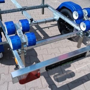 Az Alfa Marine csónakszállító utánfutó tűzihorganyzott acélszerkezete maximális védelmet biztosít a korrózióval és az időjárás viszontagságaival szemben. A csónak alátámasztását párnafák vagy görgők biztosítják, amelyek stabil és kíméletes megtámasztást nyújtanak a hajótest számára. Az erős alváz és a precízen kialakított tartóelemek kiemelkedő stabilitást garantálnak még teljes terhelés mellett is. A hátsó rész kihúzható, így a hosszabb csónaktestek is könnyedén felhelyezhetők és biztonságosan rögzíthetők. A nyitott kialakítás lehetővé teszi különféle méretű és formájú vízi járművek szállítását. A szerkezet kialakítása praktikus, könnyű kezelhetőséget és egyszerű használatot tesz lehetővé minden körülmény között. A kiváló anyaghasználat biztosítja a hosszú távú, megbízható működést. Az utánfutó jól viseli az úthibák okozta rázkódásokat és a rendszeres használatból eredő fizikai terhelést. A „További információk” szekcióban részletes adatokat talál a hajó és csónakszállító méreteiről, felszereltségéről és opcionális kiegészítőiről.